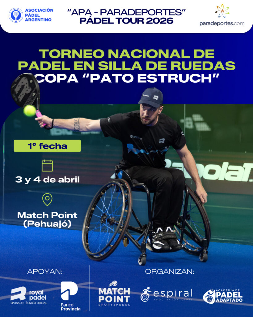 Guillermo Camusso y Julio Kowalczuck arrancaron con todo la temporada de pádel en silla de ruedas. La pareja se quedó con la 1° fecha del Torneo Nacional correspondiente al “APA - PARADEPORTES” TOUR 2026 al vencer por 1-6, 6-3 y 6-4 a la dupla de Diego Moliner y Diego Galeano. La actividad se realizó en el complejo Match Point de Pehuajó (Buenos Aires) y estuvo en juego la Copa “Pato Estruch”.